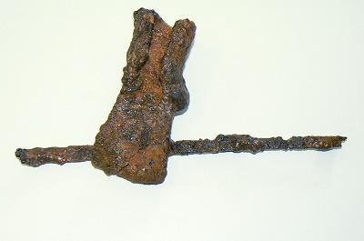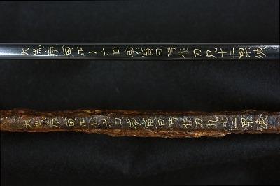 金属製品の保存処理成果としては、まず元岡G-6号墳から出土した庚寅銘大刀が挙げられます。平成23年秋に出土し、直後の透過X線調査で象嵌銘文が発見されました。その後、平成24から26年度に象嵌文字の表出作業を中心とした保存処理作業が行われ、平成27年1月に全19文字の表出が完了しました。平成28年度は、象嵌以外の部分の余分な錆の除去作業を行い、一旦、保存処理が完了となりました(写真1)。